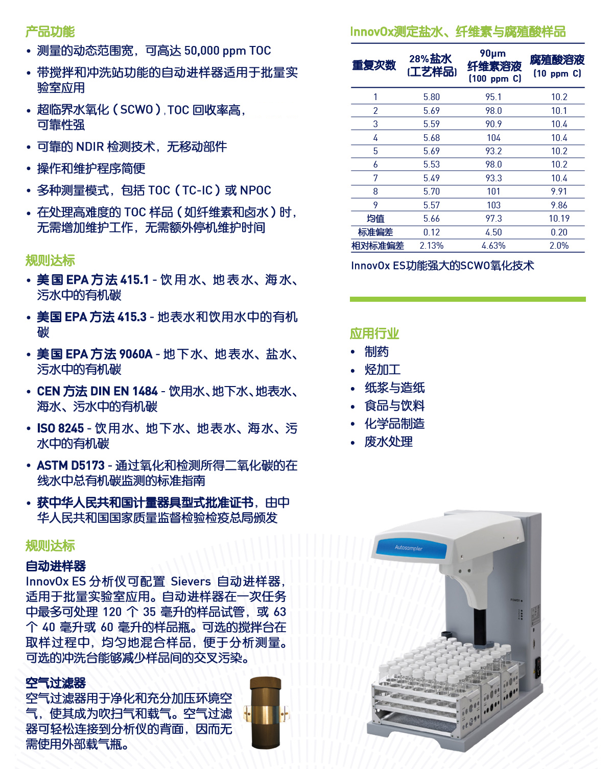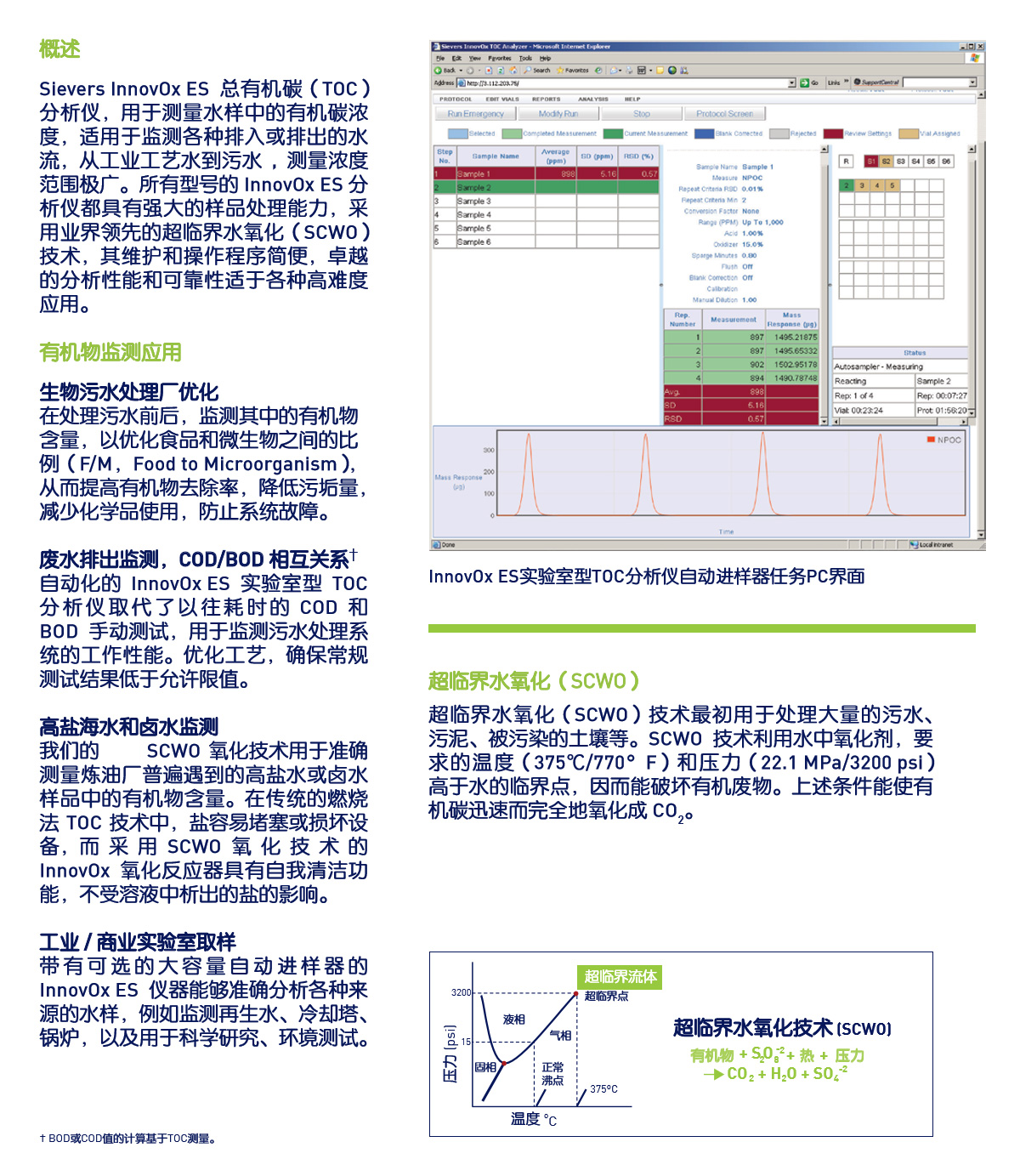 Severs Innovox ES總有機碳(TOC)分析儀,用于測量水樣中的有機碳濃度,適用于監測各種排入或排出的水流,從工業工藝水到污水,測量濃度范圍極廣。所有型號的 Innovox ES分析儀都具有強大的樣品處理能力,采用業界領先的超臨界水氧化(SCWo)技術,其維護和操作程序簡便,卓越的分析性能和可靠性適于各種高難度應用。