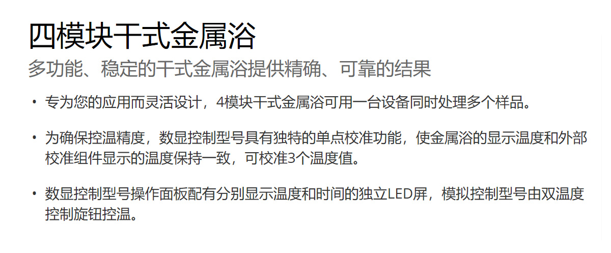 多功能干式金屬浴非常適用于具有溫度穩(wěn)定性需求的應(yīng)用。主機(jī)可放置4個(gè)模塊,共有40多款模塊供選擇,無需工具即可實(shí)現(xiàn)更換。試管和孔槽緊密接觸,極大限度提高保暖、加熱效率。數(shù)顯型號(hào)具有出色的溫度一致性、穩(wěn)定性及結(jié)果可重復(fù)性。模擬型號(hào)則是經(jīng)濟(jì)的選擇。